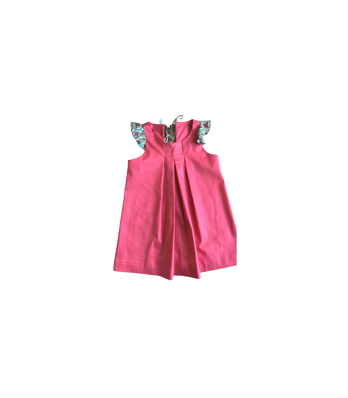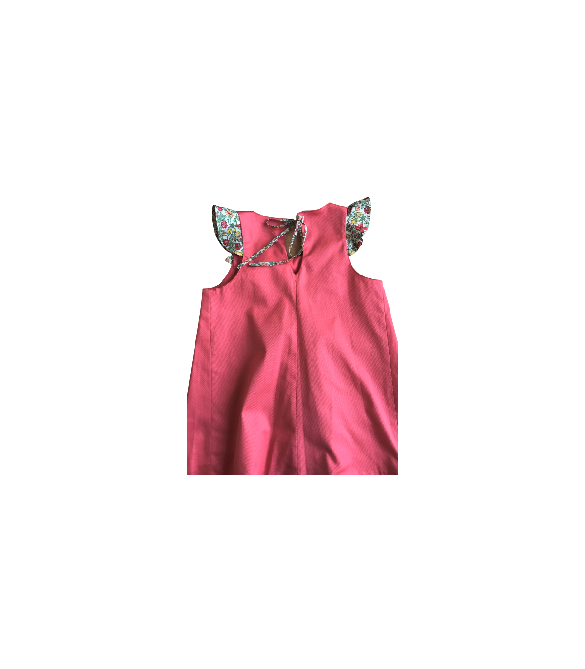 Robe en popeline avec manches en Liberty, parfaite pour mettre de la couleur en été ! S'attache dans le dos par un petit noeud en Liberty. couleur corail Lavable à la machine Confectionée avec soin par le Carmel de Migné-Auxances.
